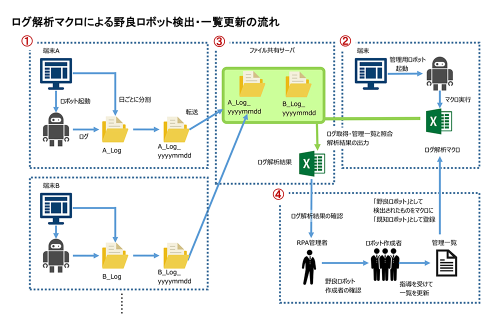 (2) 管理用に作成したロボットでログ解析マクロを実行し、ファイルサーバの実行ログを取得。マクロは各ロボットの実行ログから、ロボットの名前、稼動時間などの情報を拾い出し、それを管理一覧の内容と照合