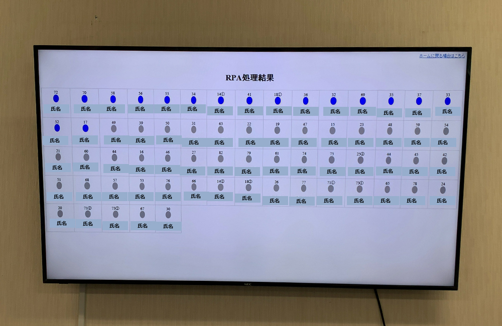 自作の簡易版WinDirector。壁掛け大画面モニターの管理画面で処理状況が一目でわかる。
