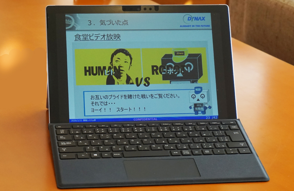 社内食堂で流した映像は、RPA担当のお二方で企画から出演、撮影、編集まで手掛けられましたが、お二方とも、映像編集経験は無かったとのこと。最近は簡単な映像編集ソフトもありますから、皆様もチャレンジされてみてはいかがでしょうか。
