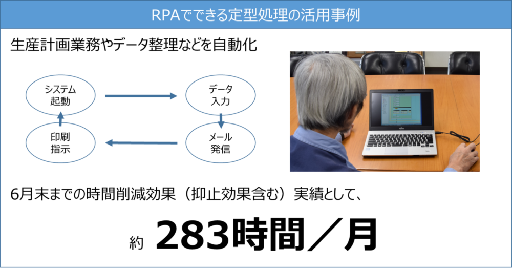具体的には、製品を作るときのスケジュール管理、実績管理、品質管理等で必要になる情報をシステムに入力・整理する作業や、基幹システムへデータを投入する作業を中心にRPA化を行っています。