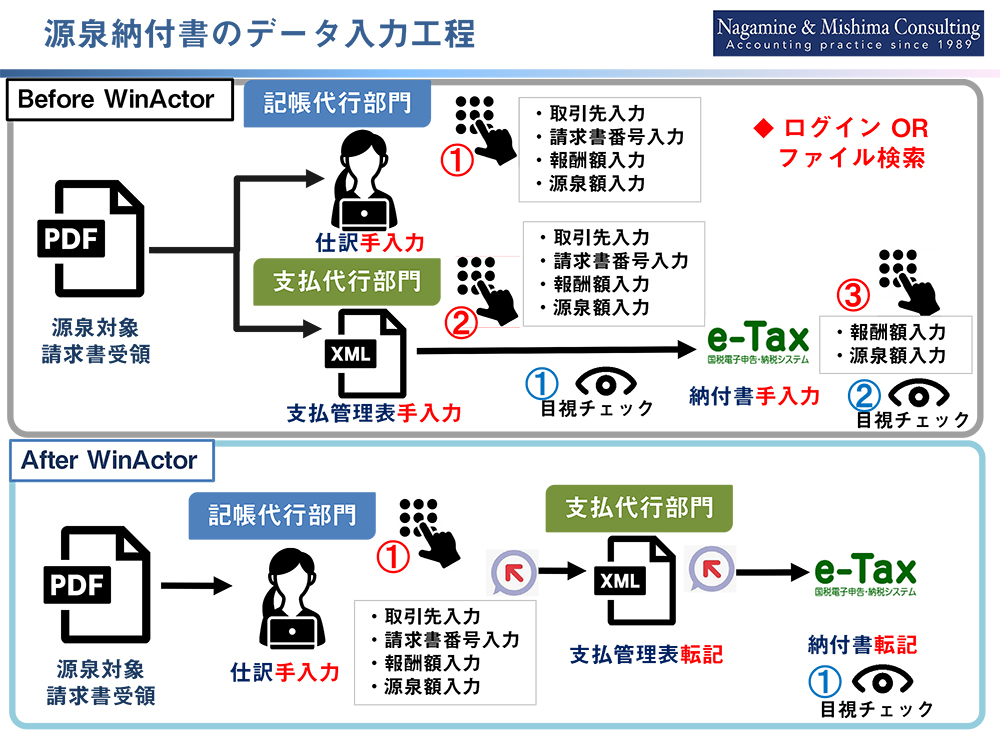 ここでWinActorが活躍しました。これまで、記帳代行部門が請求書を受領すると仕訳処理を行い、その仕訳情報をトリガーに支払代行部門の管理表作成及び納付書作成をしていましたが、これをWinActorの任務へと変更しました。