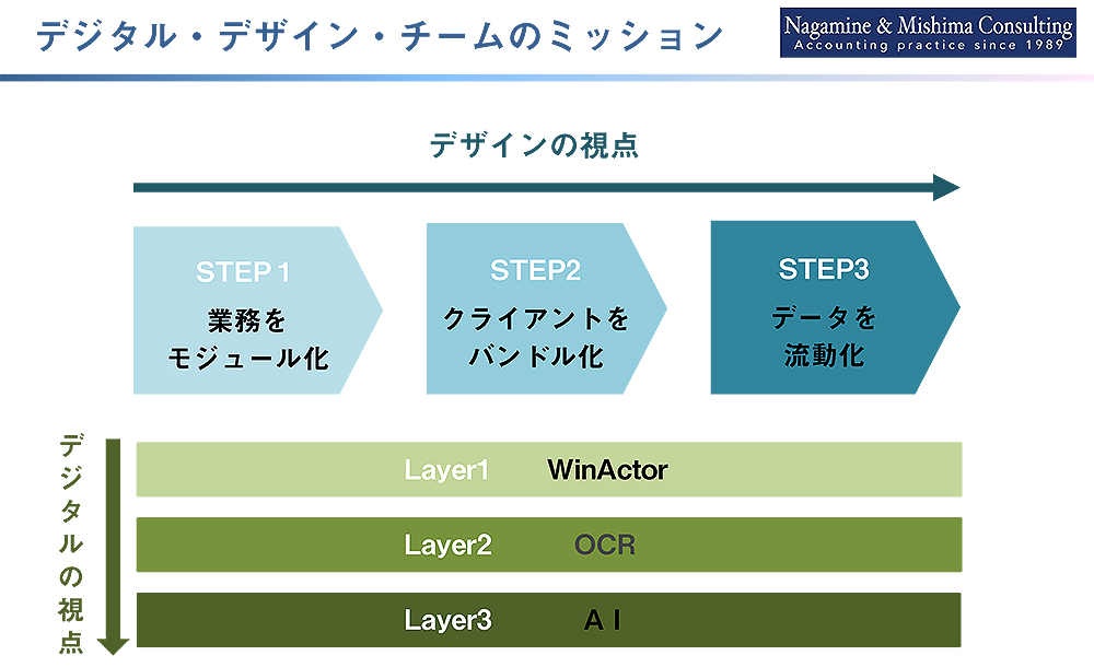 そして、三つ目のレイヤーはAIが得意とするデータ素材とアウトプットの習得です。これまで多種多様な書類を受け入れてきましたが、AIフレンドリーなインプットデータを絞り込み、反復利用する特定のデータを学習させ、OCRと連携させ、データインプットからデータ転記をシステマティックに処理するデータの流れの構築を実現させる方針だということです。