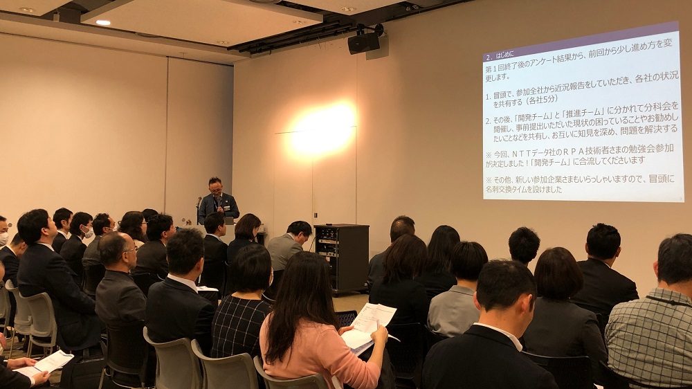 初参加の人々のための「名刺交換タイム」後、「勉強会」は各社からの近況報告で幕を開けた。「WinActor」の運用開始から2~3か月という企業が多かったが、既に10以上のシナリオを開発し、大幅な工数削減を成功させている企業も見受けられた。中には開発スタッフの確保にあたって、就労移行支援機関(障がいを持つ方の就職をサポートする組織)の紹介で、シナリオ開発専任者を採用されたという企業もあった。当日は支援機関からご担当も参加されており、IT分野で活躍される方が増えていることを紹介していた。