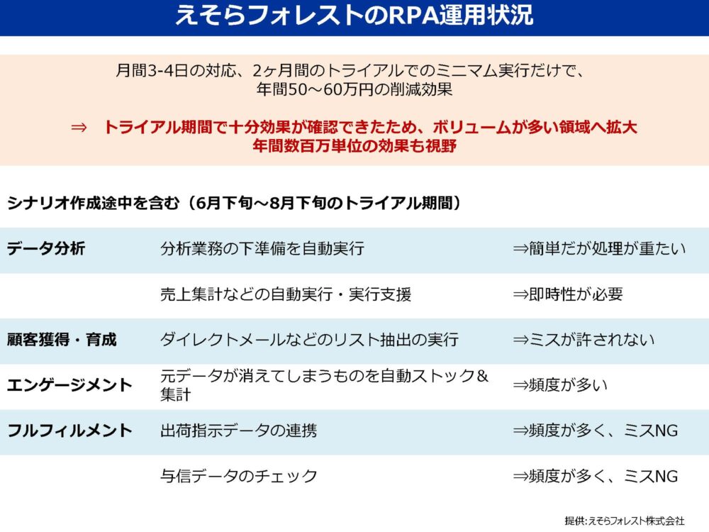 江島氏は他にも、顧客リスト抽出作業(購入データなどで顧客を絞り込み、ダイレクトメール送付などに利用)や、コールセンターの電話応答率チェック作業の自動化、卸販売向けに導入したカートシステムへのデータアップロード業務等の自動化も成功させています。