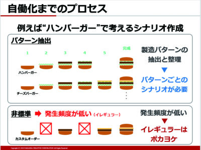「パターンについての考え方を、私はハンバーガーに例えて説明しています。普通のハンバーガーは【バンズを置く】【レタスをのせる】【パティをのせる】【タマネギやソースなどをのせる】【バンズをのせる】という工程でできあがりますが、もし、チーズバーガーをつくらなければならないこともあるというのであれば、どこかで【チーズをのせる】という工程を入れた、別のパターンを用意しなければなりません」