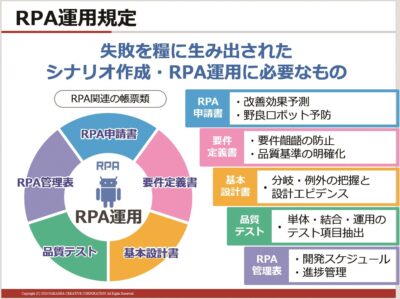 こうした業務選定方針に加え、定義された要件の解釈違い・シナリオの作成ミスを防ぐために、必要な帳票類(RPA申請書・要件定義書・基本設計書・品質テスト・RPA管理表)を準備し、さらには教育体制も強化しました。RPA支援チームが講師を務める技術講習の他、動画を見ながら自席で独習できる仕組みも整えています。