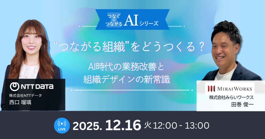 | タイトル | 【つなぐ・つながるAIシリーズ⑥】 “つながる組織”をどうつくる?AI時代の業務改善と組織デザインの新常識 |