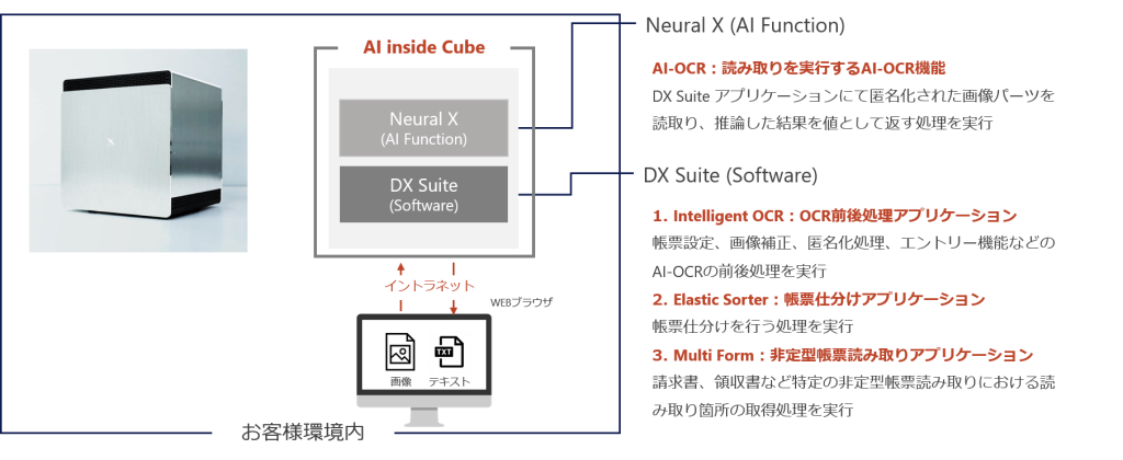 AI inside Cubeは閉塞環境でAI-OCRが利用可能なモデルです。個人情報やマイナンバー、機密情報などインターネット経由で外部に送信することはできないといったケースでも、AI inside Cubeならネット環境不要なため、よりセキュアな業務への対応が可能になります。